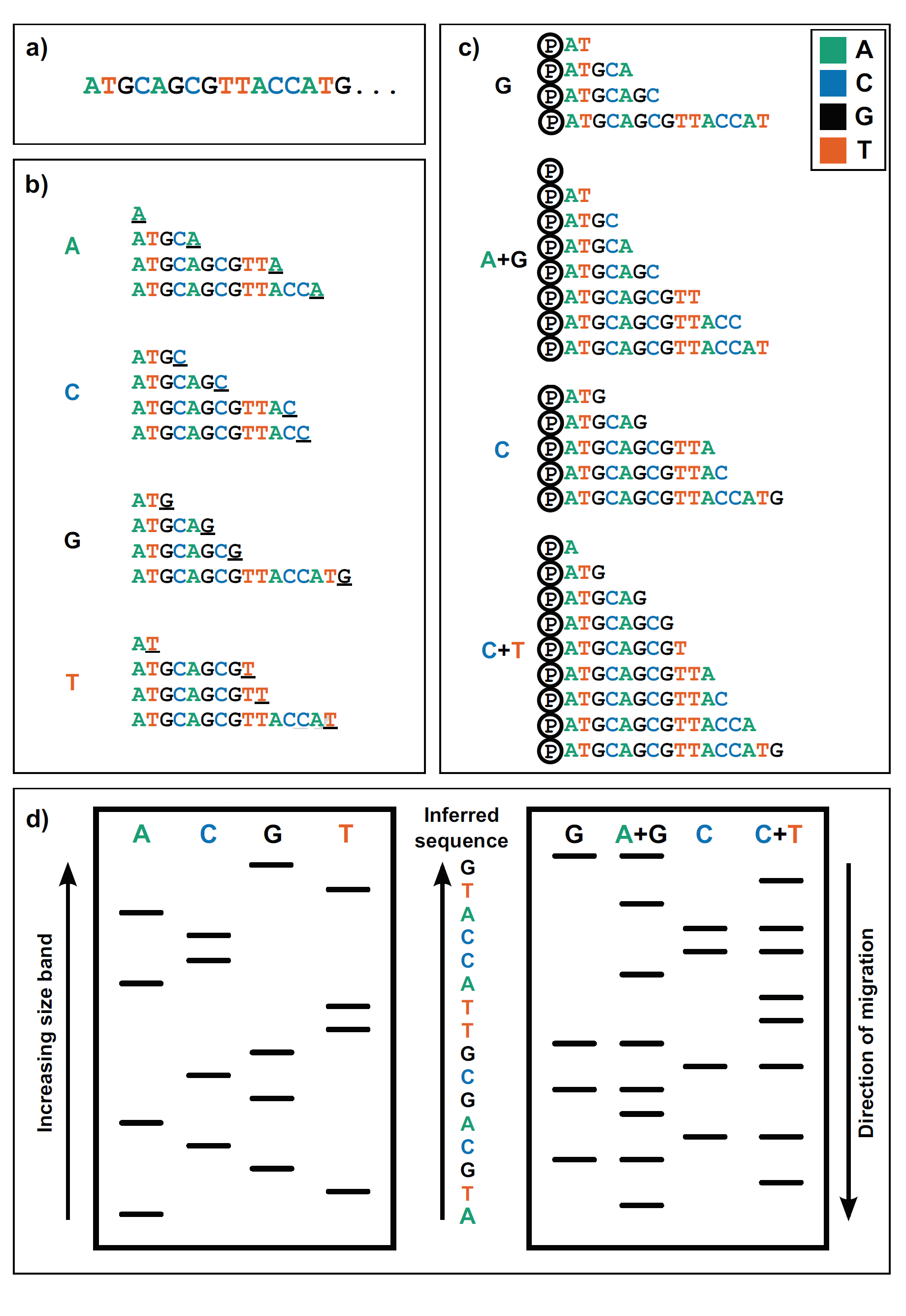 (b): Sanger's ‘chain-termination’ sequencing. 일단 통합되면 추가 확장을 방지하는 특정 유형의 방사성-표지된 또는 형광-표지된 ddNTP 뉴클레오티드는 DNA 중합 반응에 저 농도로 포함된다 (5’ 시퀀스에서 primed됨, 그림에서 나와 있지는 않음). 따라서 네 가지 반응 각각에서 ddNTP가 해당 염기의 특정 인스턴스 (밑줄 친 3’ terminal 문자)에 무작위로 통합됨에 따라 3’ 절단 (truncations)을 사용하여 서열 단편이 생성된다.