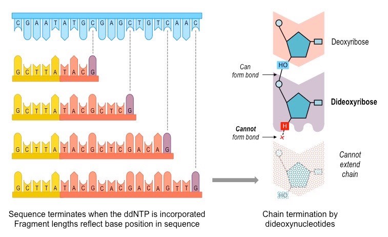 전자는 그 당의 30번 위치에 수산기(hydroxyl)(OH) 대신 수소(hydrogen)(H)를 갖고 있기 때문에, 합성되는 ssDNA에 일단 통합되면 후속 중합을 차단한다. 따라서 이 방법론은 디데옥시 터미네이터 서열분석(dideoxy-terminator sequencing)으로 알려져 있으며, 어닐링된 프라이머가 DNA 중합효소에 의해 확장된 후 각각의 모든 뉴클레오티드 위치에서 종결된 ssDNA 분자의 확률론적 집단을 효과적으로 생성한다.