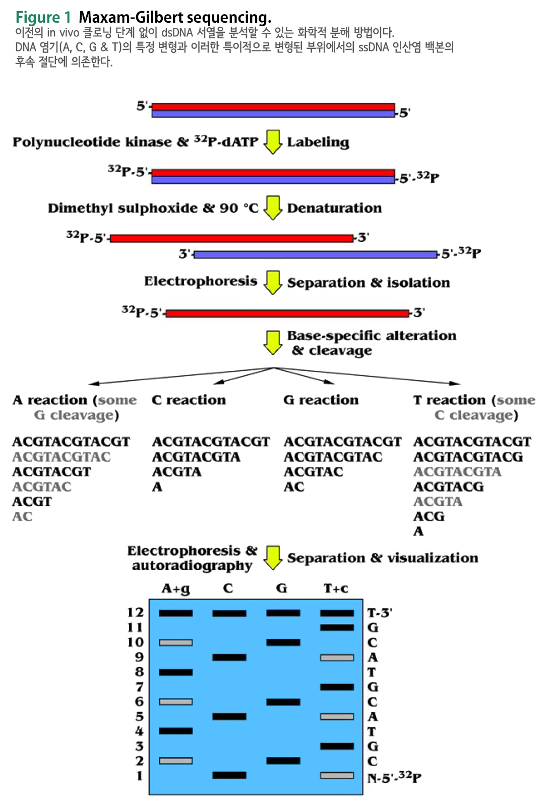 Maxam-Gilbert Sequencing 방법에서는 5' 말단이 방사성 표지된 DNA 단편이 서로 다른 뉴클레오티드(예: A와 G, G, C와 T 또는 C)에서 화학적으로 절단된다. 절단된 조각은 겔 전기영동으로 분리되고 자동 방사선 촬영으로 검출된다 (Figure 1).