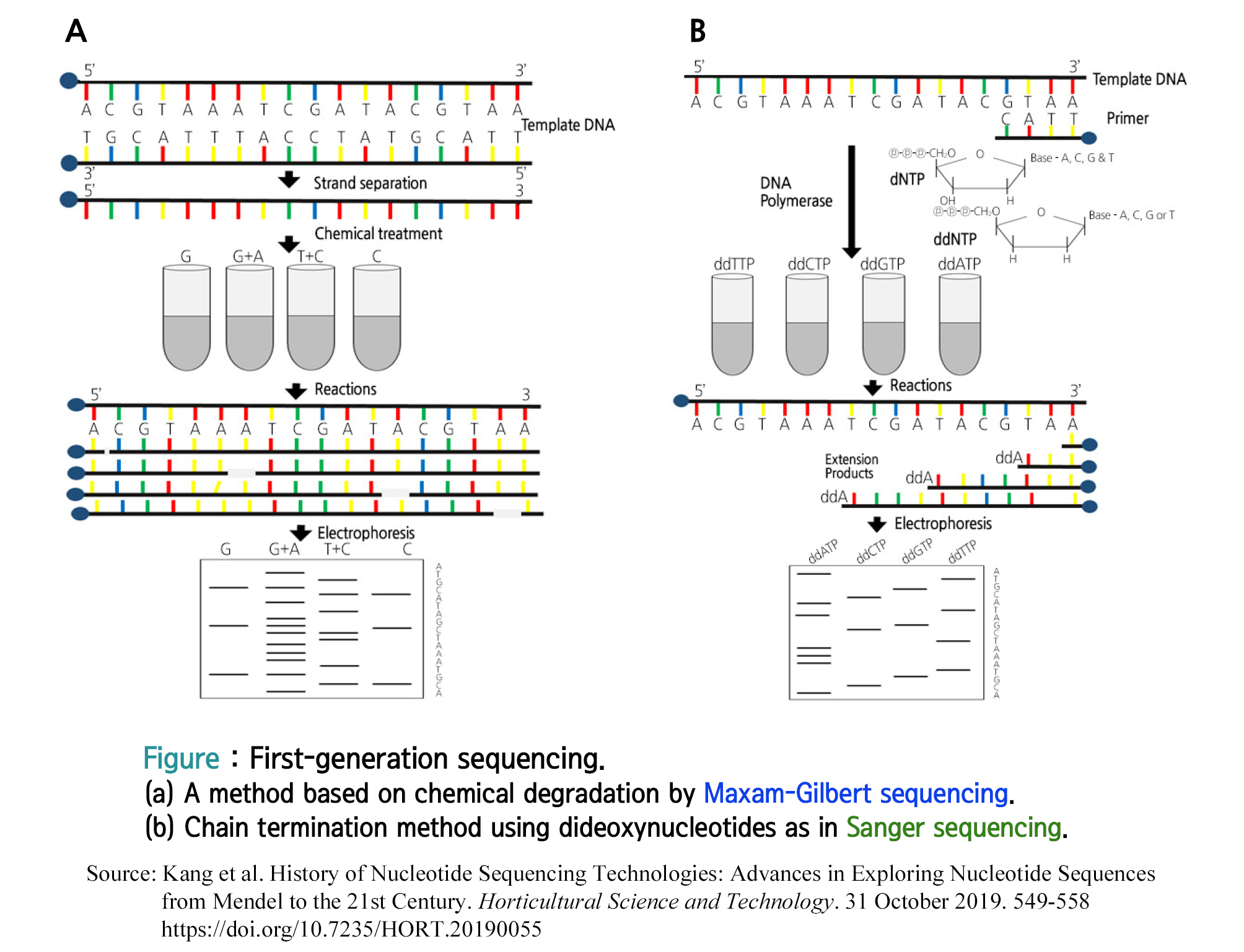1세대 핵산 서열 분석의 두 가지 주요 방법론은 아래에 설명되어 있다 (Maxam-Gilbert 및 Sanger).