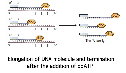 프라이머는 템플릿 DNA에 어닐링하고, DNA 중합효소는 dNTP 또는 ddNTP를 무작위로 추가하여 프라이머를 확장하지만, ddNTP가 통합되면 반응이 종료된다. 이러한 데옥시뉴클레오타이드는 디데옥시뉴클레오타이드보다 크기 때문에 종료는 프라이머 영역 근처에서 발생하지 않는다. 예를 들어, dATP가 연장 중에 결합하면 연장이 중단되고 시퀀스는 A로 읽힌다. 마찬가지로 ddGTP, ddTTP 또는 ddCTP가 추가되면 시퀀스는 각각 G, T 또는 C로 읽힌다.