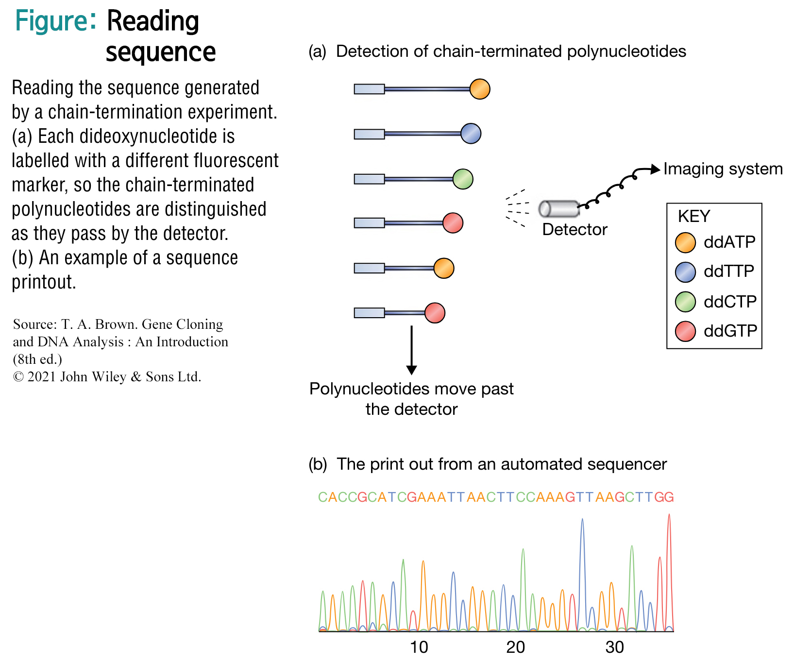 그 시퀀스를 결정하기 위해서, 첫번째 DNA sequencing method, the “chain termination method” 또는 Sanger sequencing은 방사능 표지된 부분적 분해된 단편들을 사용하여, Frederick Sanger에 의해서 1997년에 개발되었다.
