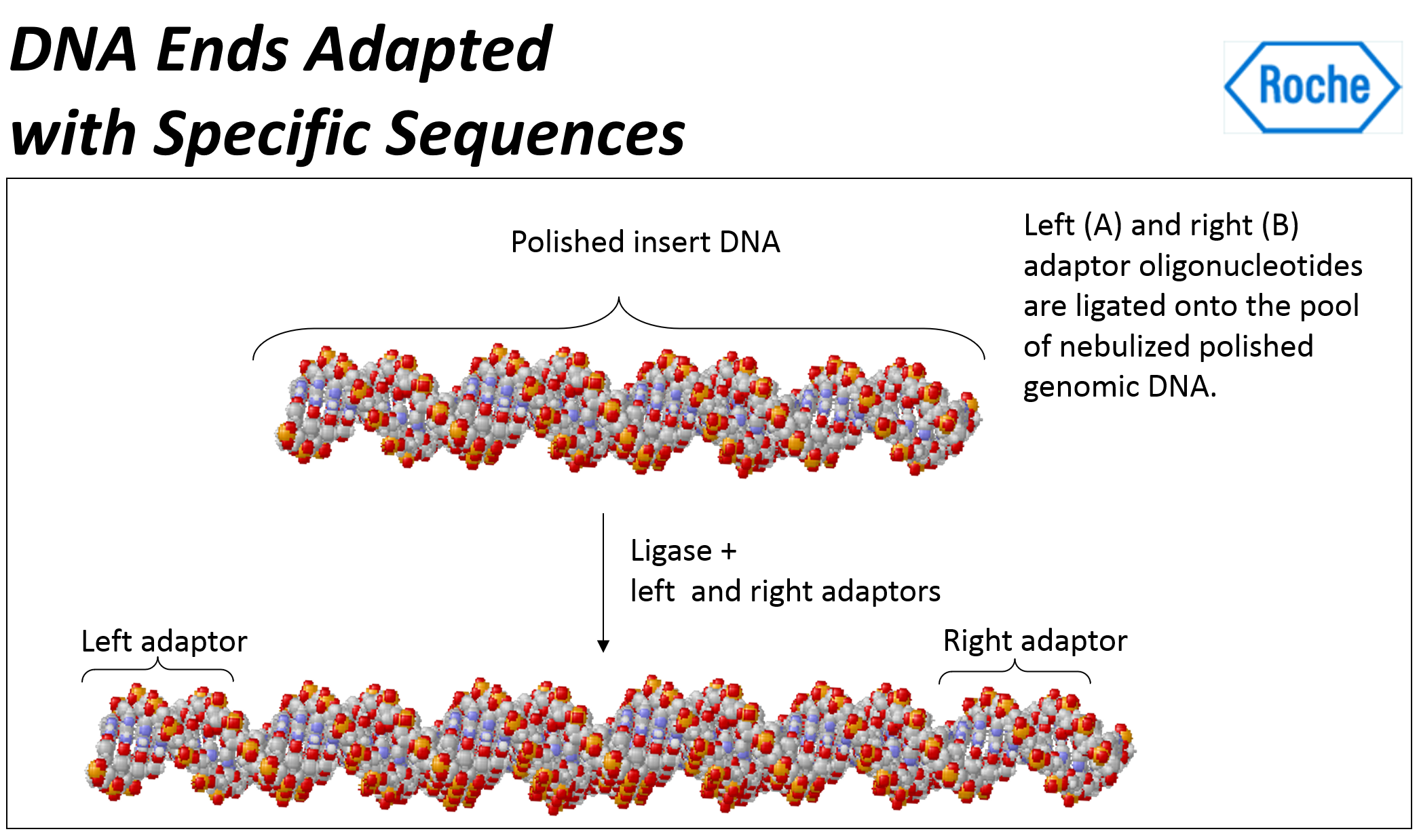 즉, 어댑터라고 불리는 짧은 DNA 서열이 DNA 단편에 부착된다. 양쪽 끝에 다른 어댑터들을 부착한다. - "A"어댑터와 "B"어댑터는 길이가 44 bases이고, 그중 20 bases는 PCR 프라이머 요소이고, 20 bases는 시퀀싱 프라이머이며, 4개는 key이다. "B"어댑터에만 5' end에 Biotin이 포함되어 있다.