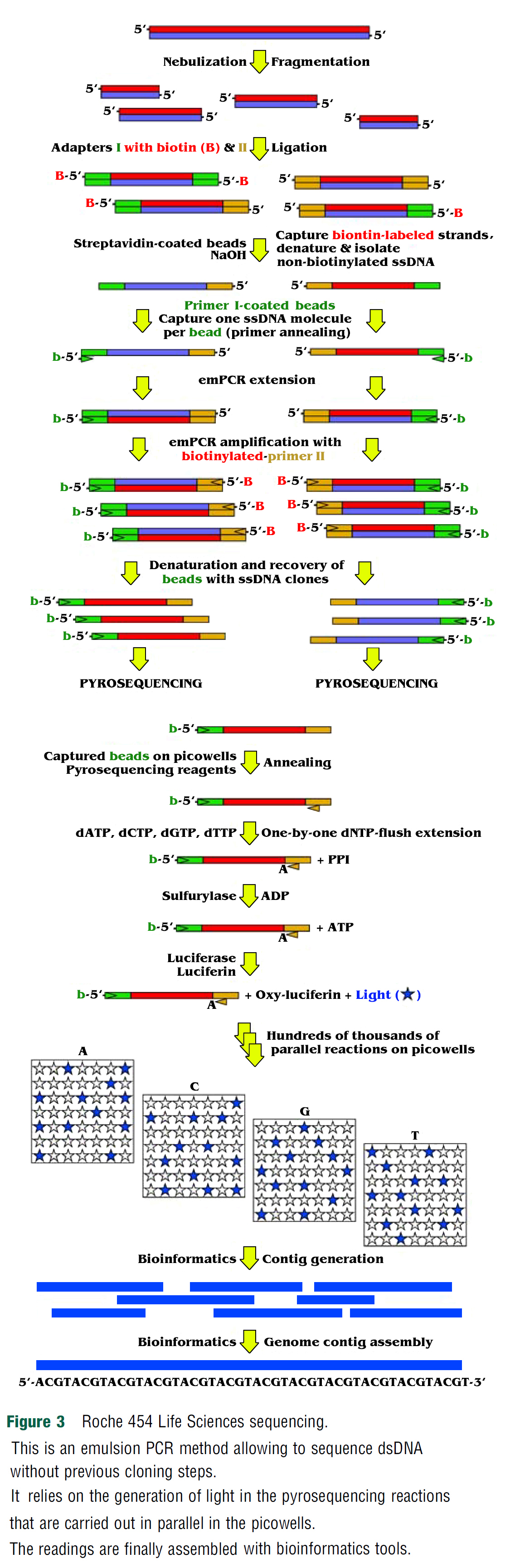 dNTP의 각 종류는 그 반응에서 독특한 형광색에 따라 측정될 수 있으므로, DNA 시퀀스가 그 형광색에 따라 측정될 수 있다. - 반응 후에는, ATP가 diphosphatase에 의해 분해되어, 플루오레세인을 퀀칭하고, 시퀀싱 반응은 다음 사이클로 간다.