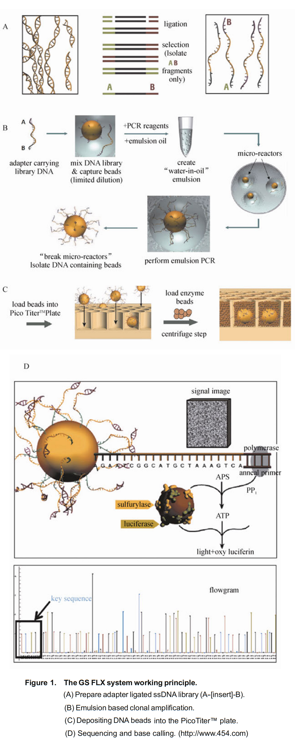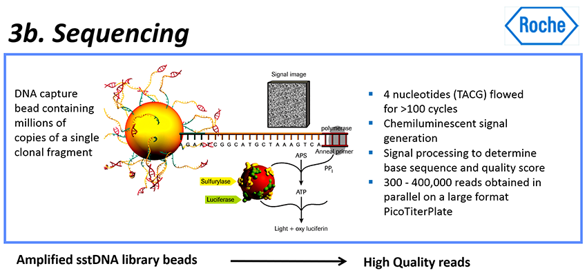 - DNA 중합효소(polymerase)에 의해 뉴클레오티드가 추가되면, 설퍼릴라제 (sulfurylase), 루시퍼라제 (luciferase) 그리고 루시페린 (luciferin)과 관련된 반응이 일어나 빛(光, light)을 생성하며, 이 빛은 수십만 개의 피코웰(picowells) 각각에 대해 동시에 검출기에 의해 기록된다.