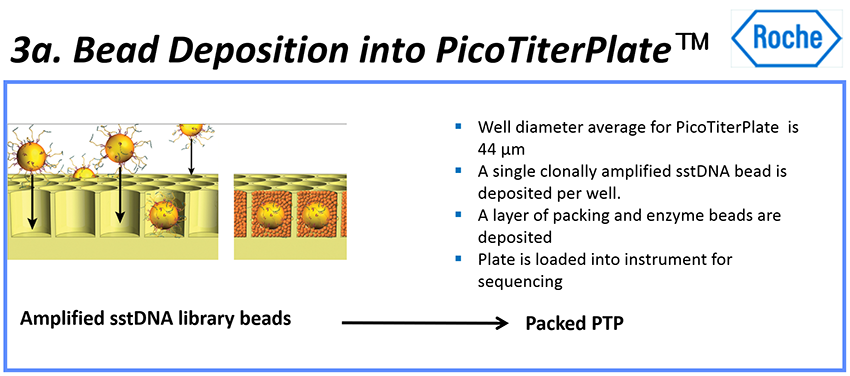 - 그런 다음 나머지 비드들을 시퀀싱 반응에 필요한 DNA 중합효소(polymerase enzyme) 및 프라이머가 포함된 효소 비드들(enzyme beads)과 함께 시퀀싱 플레이트의 웰에 넣는다 (웰당 비드 1개).