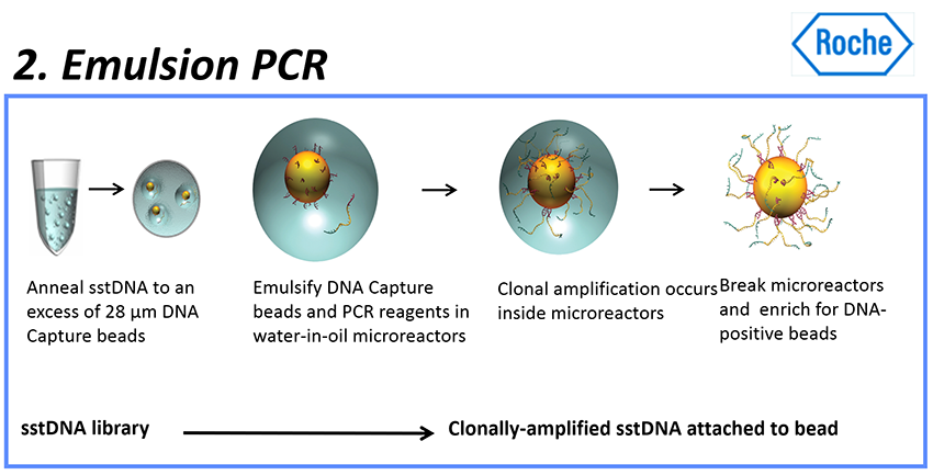 - 포획된 ssDNA는 비오티닐화된 프라이머 (biotinylated primers)를 사용하는 emulsion PCR (emPCR)에 의해 증폭된다.