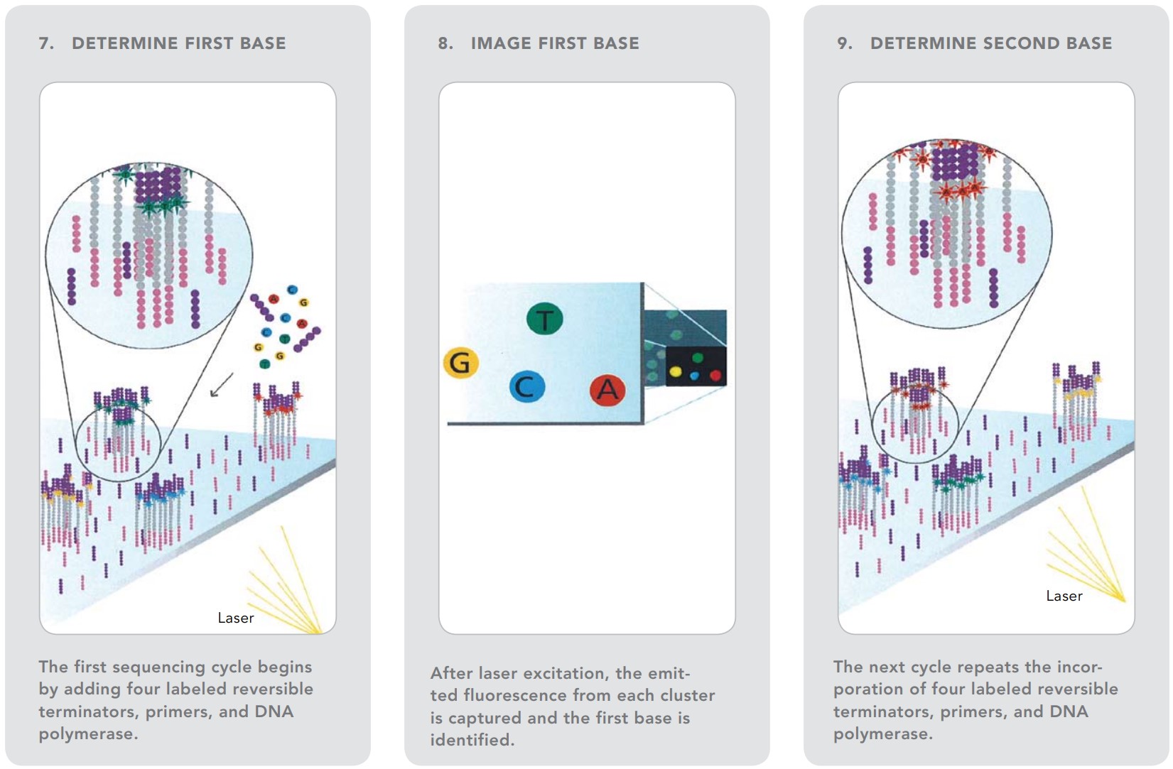 Illumina 시퀀싱은 수백만 개의 DNA 단편을 병렬로 시퀀싱하는데 사용되는 합성 방법이다. 표준 Illumina 프로토콜의 경우 DNA 샘플을 단편화(fragmenting), 정제(purifying) 및 증폭(amplifying)하여 라이브러리를 준비한다. 그런 다음 각 단편의 시퀀스를 동시에 결정하고 'normal reference' 게놈에 대해 컴퓨터로 정렬한다.