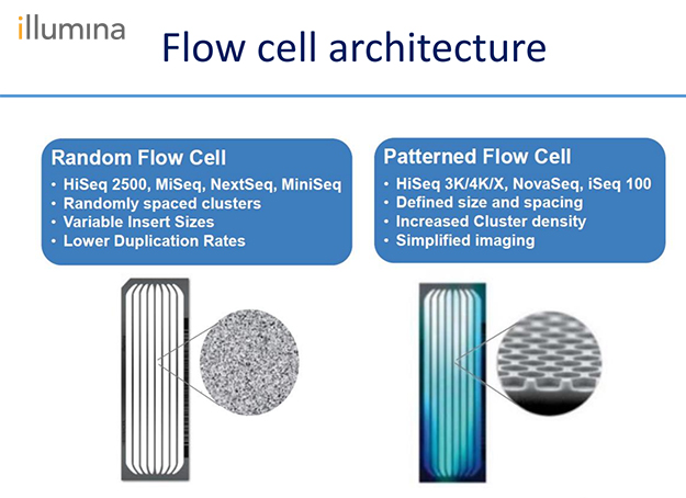 Illumina sequencing에서 사용되는 핵심 부품 중 하나가 플로우 셀이다. 플로우 셀은 두가지 타입이 있다.