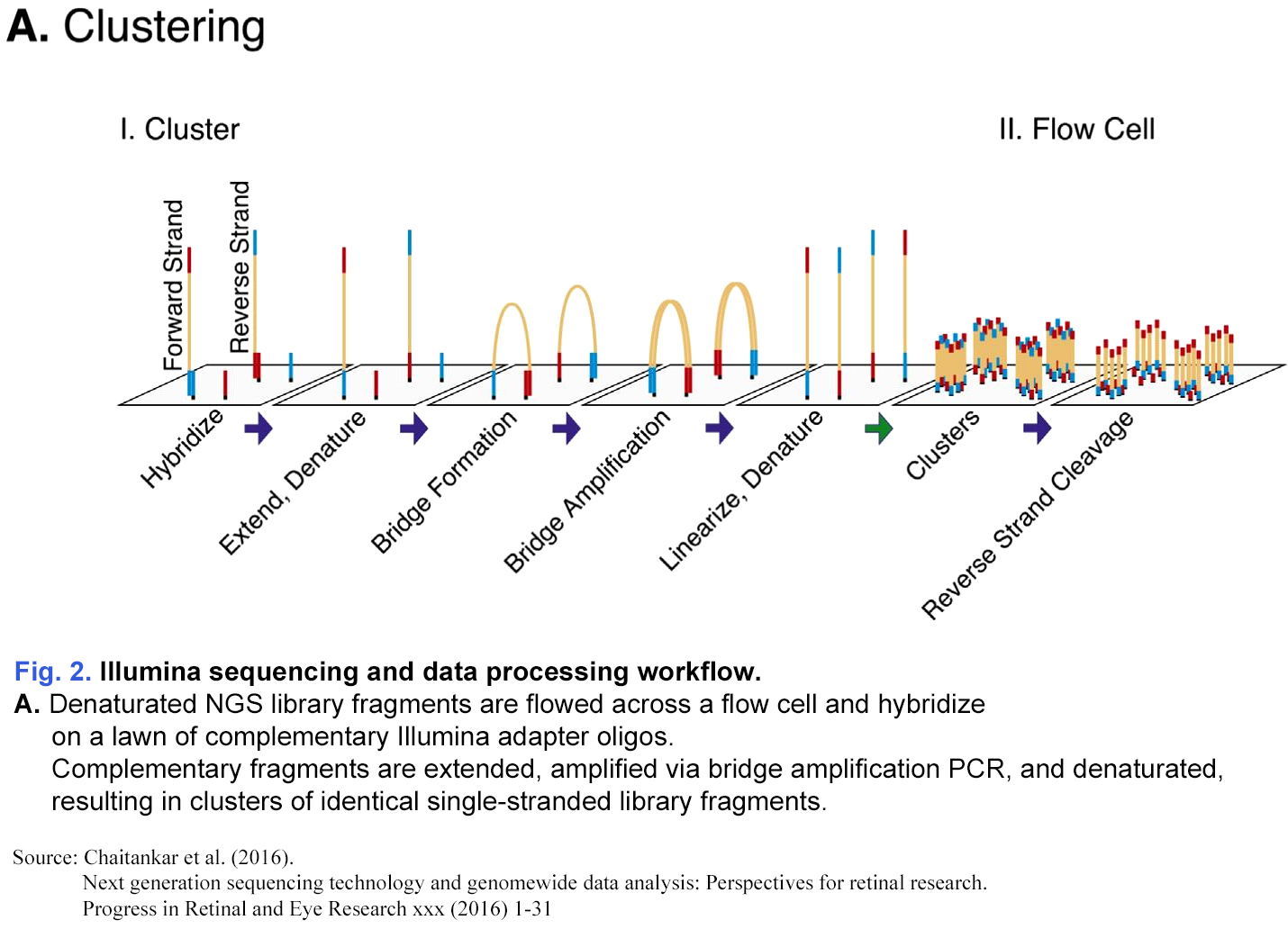 5단계: 이러한 고정된 서열(immobilized sequences)은 DNA 시퀀싱 전에 증폭되어야 하며, 이 단계는 클러스터 생성 (cluster generation)이라고도 한다.