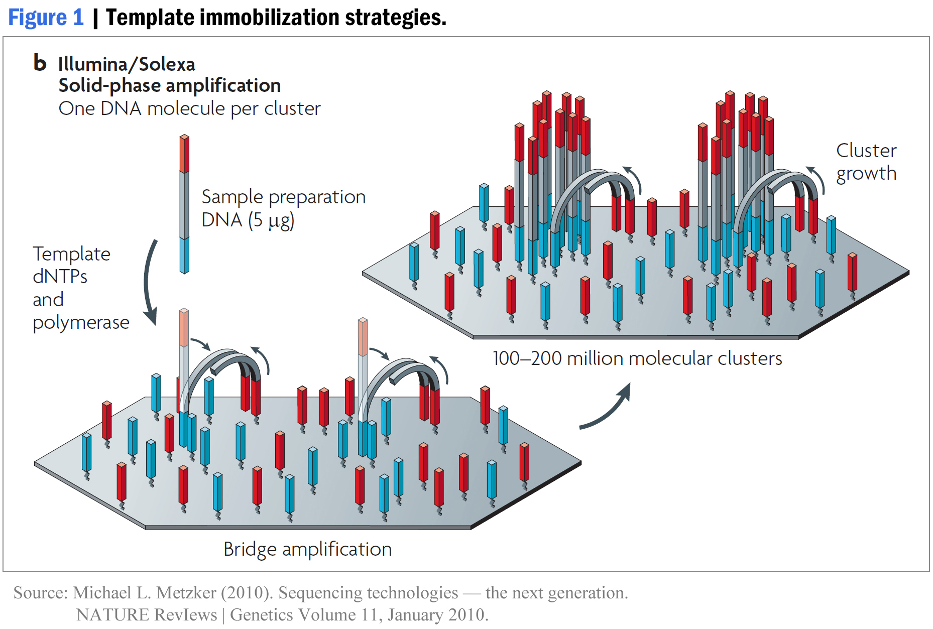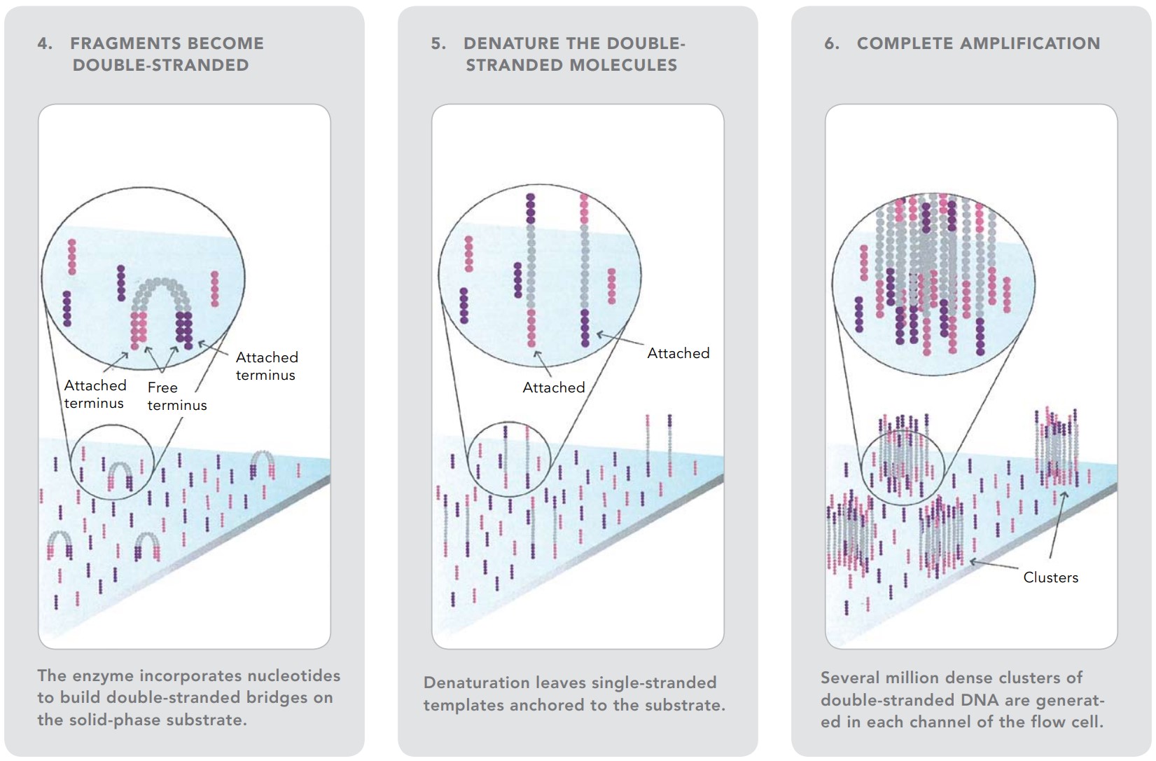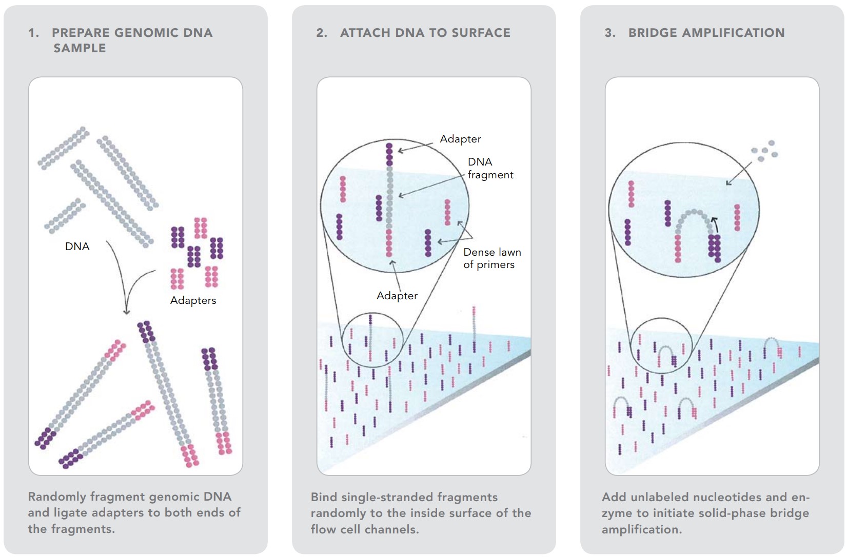 Illumina sequencing은 브릿지 증폭이라는 테크닉에 기반하는데, DNA 분자들이 상보적 올리고 뉴클레이티드들을 함유하고 있는 글래스 플로우 셀에서 복제된다.