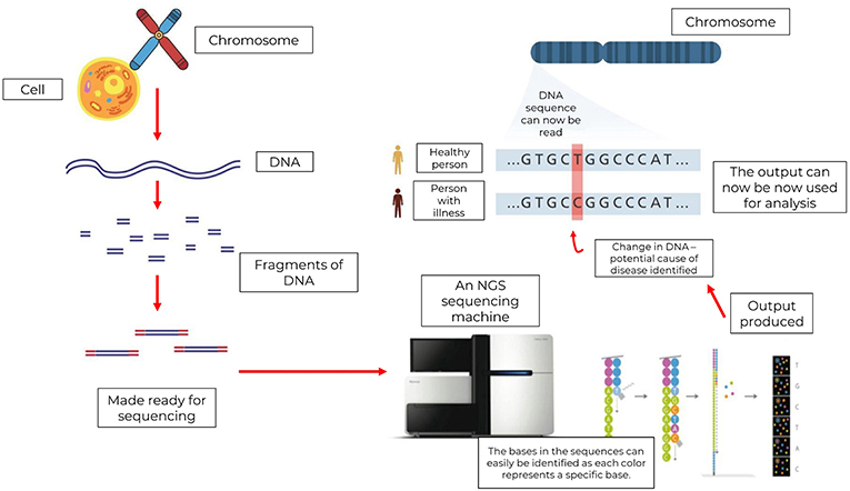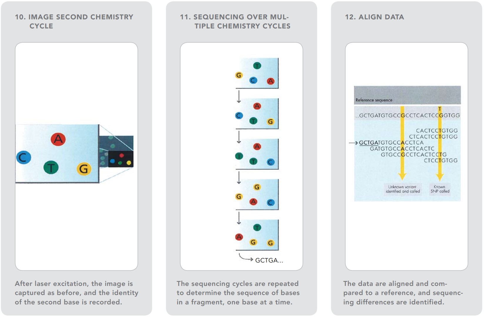 NGS (Next-Generation Sequencing)에서는 많은 DNA 가닥이 세포에서 제거되어 더 작은 조각으로 잘린다. 그런 다음 이러한 단편을 반응 혼합물이 포함된 플로우 셀이라는 플레이트에 배치하여 시퀀싱을 위한 준비가 완료된다. 시퀀서는 여러 가지 화학 반응을 수행하고 새로운 염기가 추가될 때마다 플로우 셀에서 방출되는 형광색을 식별하여 DNA 염기 서열을 읽는다. 이러한 신호는 소프트웨어로 해석되어 원본 DNA 서열의 디지털 사본을 구축할 수 있다. 이제 과학자들은 이 데이터를 사용하여 암과 같은 질병을 일으킬 수 있는 유전자의 변화를 찾을 수 있다.