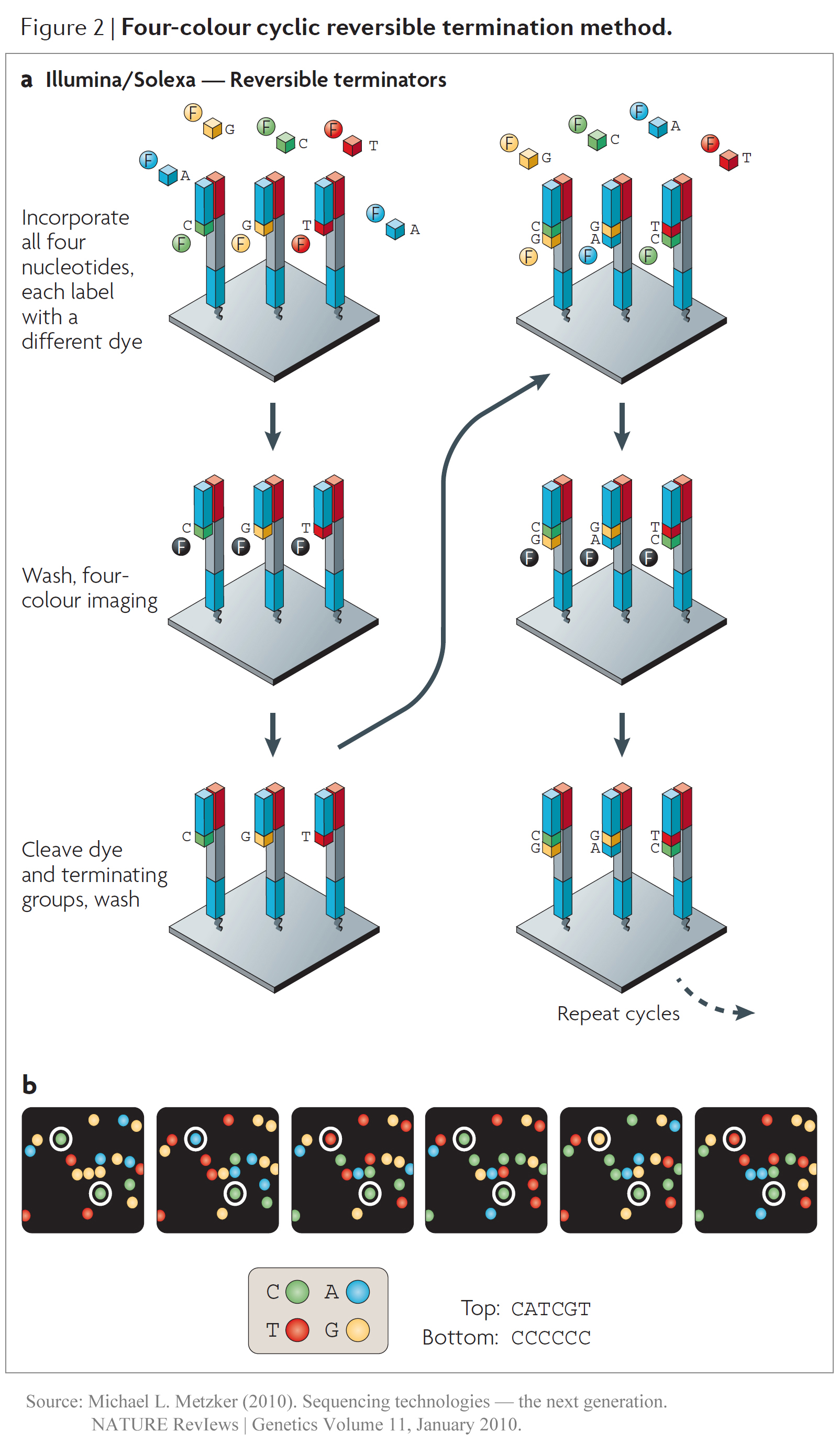 전통적인 Sanger method는 디데옥시뉴클레오티드 (dideoxynucleotide)를 사용하여 불가역적으로 프라이머 확장을 종결시키는 대신, Illumina reversible-terminator sequencing은 변형된 뉴클레이티드들이 가역적 종결 (reversible termination)에 사용된다는 점에서 생어 시퀀싱 방법과 다르다.