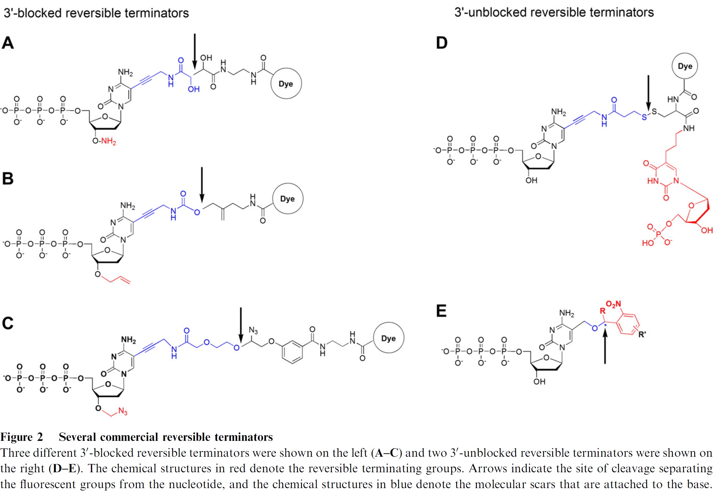 첫 번째 유형의 경우, 3'-OH에 blocking group이 있는 시중에서 판매되는 reversible terminators가 3개 있다 (위의 그림 Figure 2A-C에 표시된 구조) :