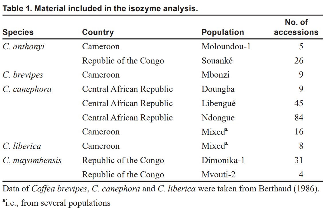 각 종은 두 개체군들이 대표하였다 (Table 1) (Anthony & al, 1985; Namur & al, 1987). - 전기영동(Electrophoresis) 데이터가 Berthaud (1986)에 의해 설명된 방법들을 따라 기록되었다.