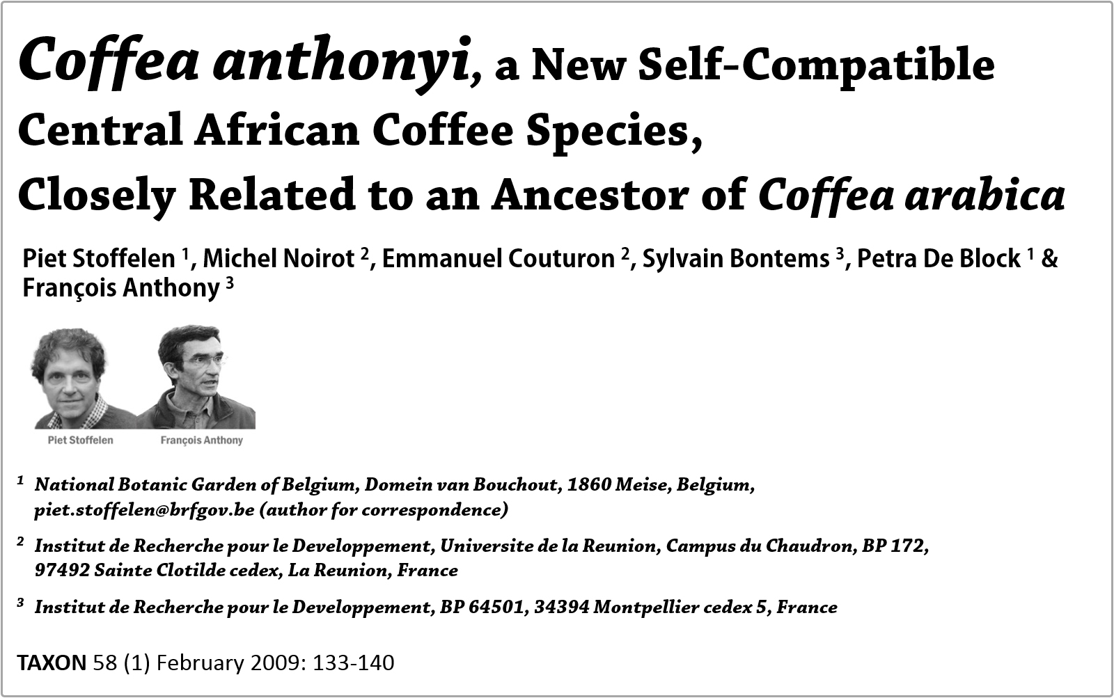 카메룬(Cameroon)과 콩고 공화국(Republic of Congo)의 코페아 앤서니 Coffea anthonyi Stoff. & F. Anthony가 공식적으로 기술된다. 형태학적, 생화학적 및 분자적 특성, 아이소자임(동질효소, isozyme) 다양성 및 계통발생론적 관계가 논의된다. 이 새로운 이배체 종은 동아프리카 C. eugenioides 및 이질사배체 재배 C. arabica와 강한 관계가 있다. 따라서 C. arabica의 조상 종과 관련이 있을 수 있다. 이 새로운 종은 자가-화합적(self-compatible)이며, 이는 Coffea 속 내에서 희귀한 특성이다. 이 새로운 소엽의 중앙 아프리카 종은 계통발생론적 관점 뿐만 아니라 육종 관점에서도 특히 관심을 끈다.