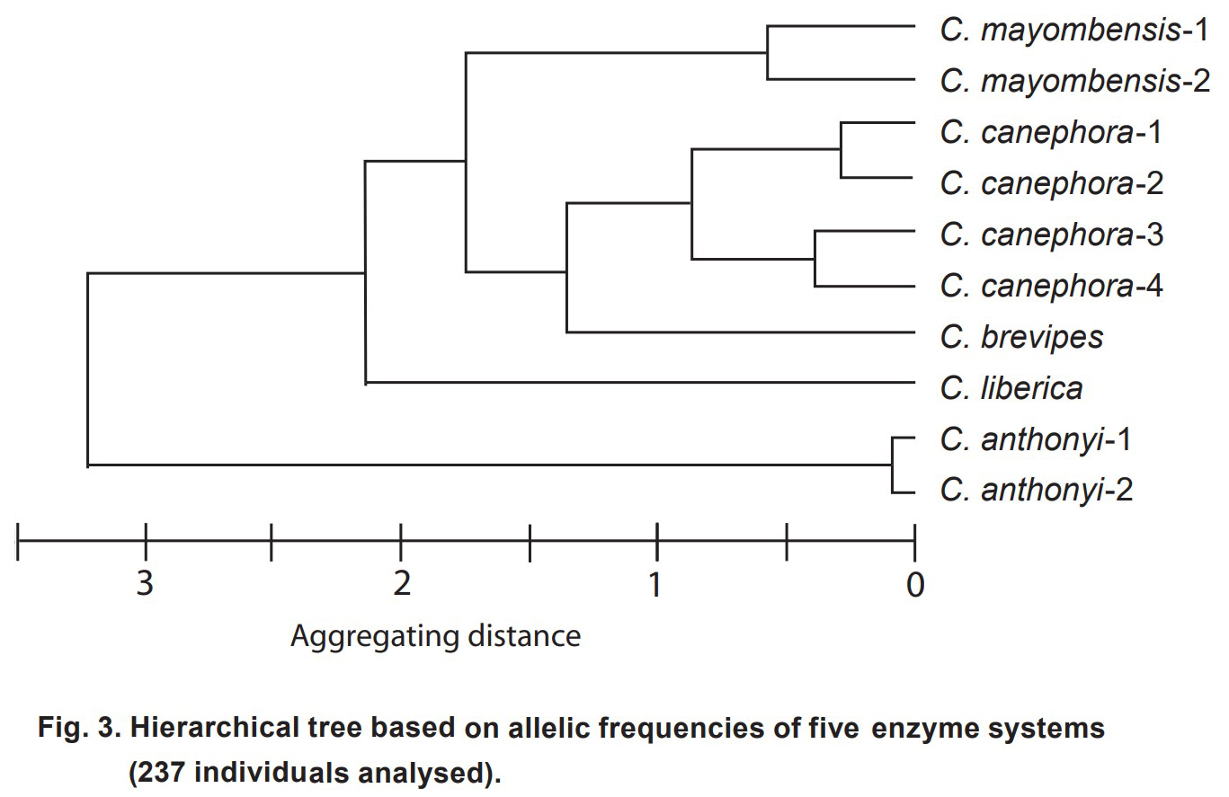계층수(hierarchical tree)를 생성하였다. - 중앙아프리카 토종인 3개의 잘 알려진 종들 (즉, C brevipes, C canephora, C. liberica)에 관한 데이터는