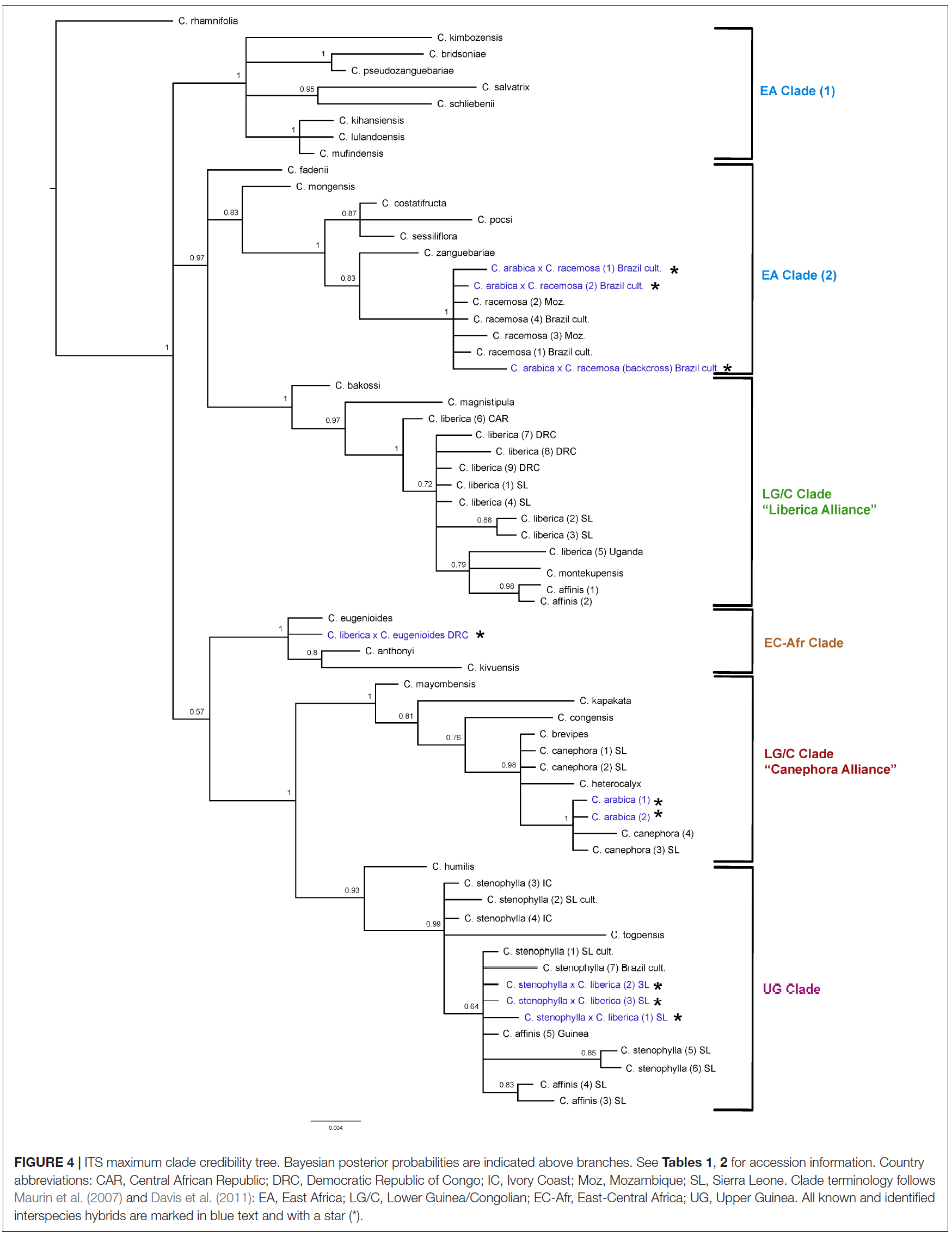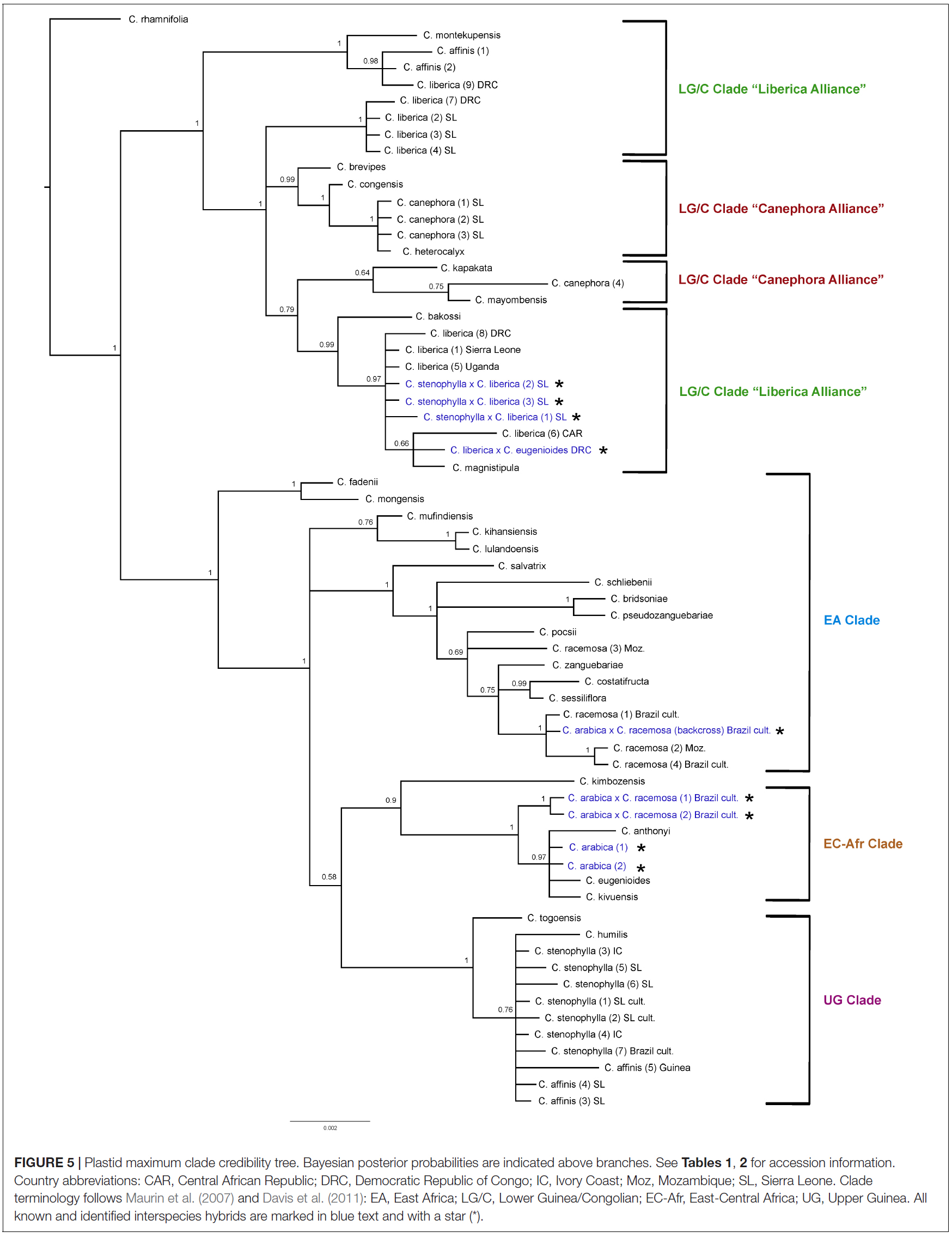 C. liberica × C. eugenioides [원래는 C. heterocalyx로 등록됨(Maurin et al., 2007)]. - 초기 분석은 연구 종(위 참조)과 아프리카, 마다가스카르, 마스카렌, 아시아 커피 종의 글로벌 데이터 집합 (Maurin et al., 2007; Davis et al., 2011)을 사용하여 수행되었다.