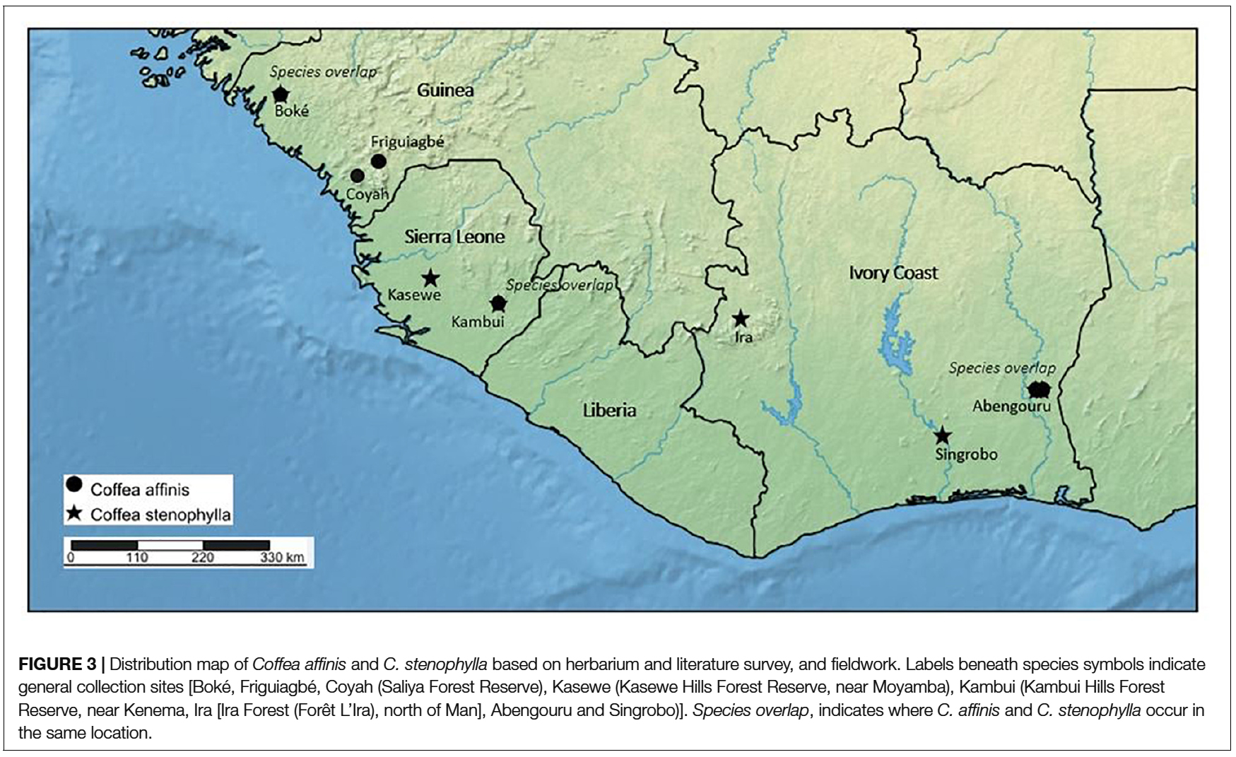 - Coffea affinis는 이전에 기니와 Ivory Coast에서만 발견된 적이 있었지만 시에라리온에서는 처음으로 야생에서 발견되었다.