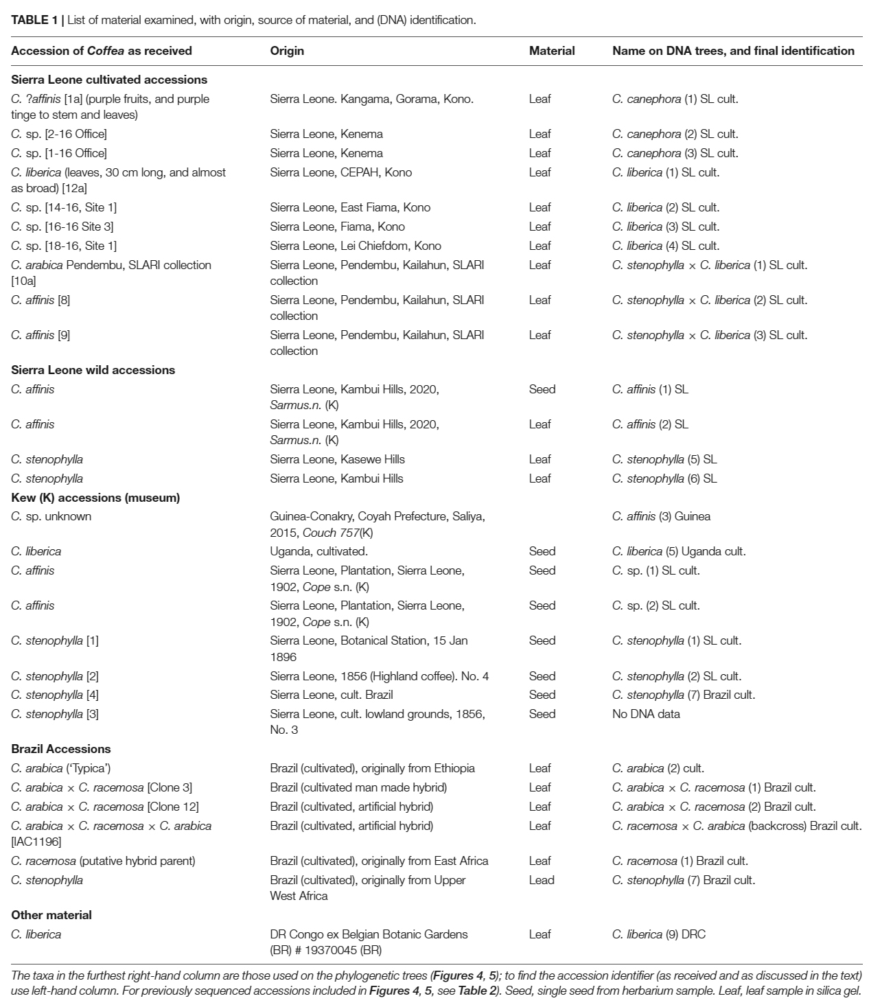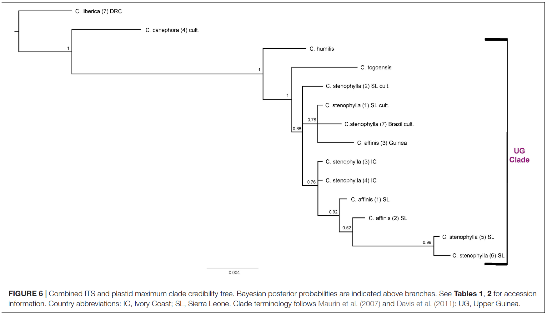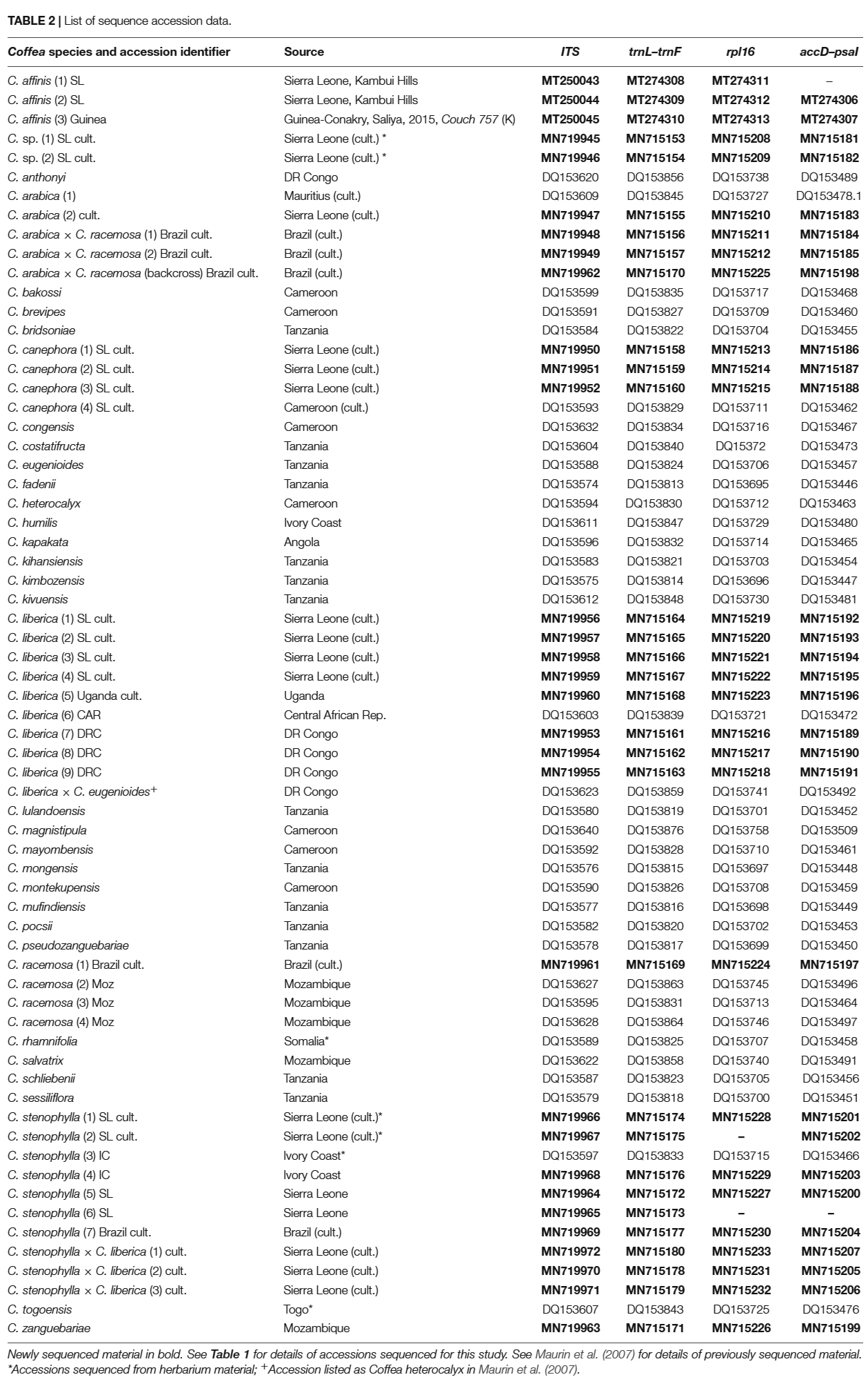 C. zanguebariae의 미공개 시퀀스 1개 (Table 2). - C. stenophylla와 C. affinis의 5개 박물관 컬렉션은 시에라리온에서 각각 19세기 말과 20세기 초에 재배된 진짜 자료를 나타내기 위해 선택되었다.