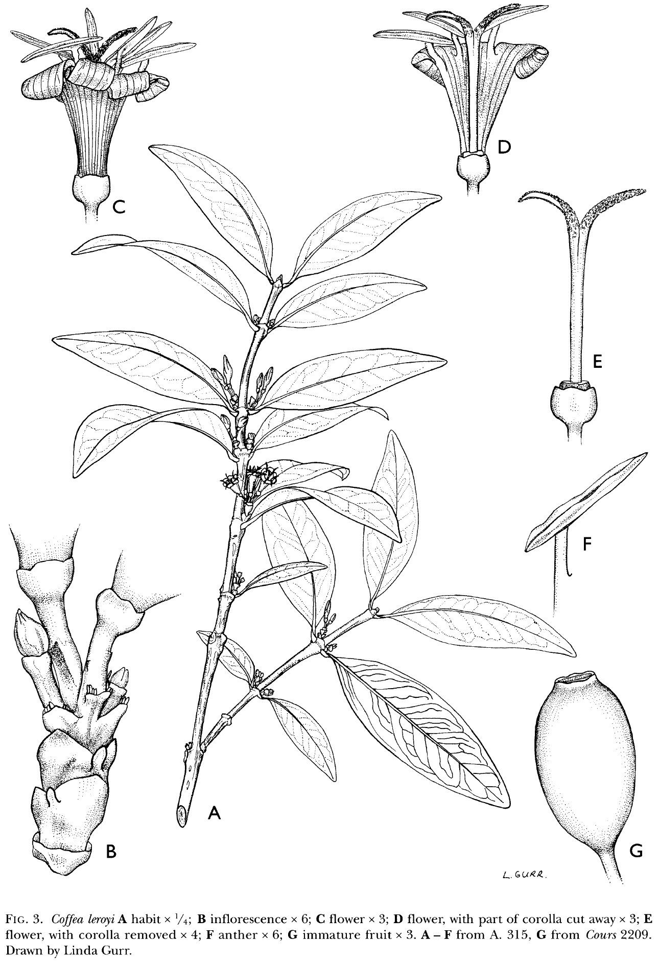 - Coffea alaotrensis와 C. perrieri var. alaotrensis는 J.-F. Leroy가 이 개체에 대해 식물 표본에 사용한 임시 이름이었다. 그러나 우리는 Lac Alaotra (Herb. Jard. Bot. de Tan. 4358 d, P!)의 표본이 Lac Alaotra 근처의 농업 기지에서 재배한 경작된 재료로 만들어졌을 것이라고 믿기 때문에 alaotrensis라는 별칭을 사용하지 않기로 결정했다. 우리는 마다가스카르에서 현재 알려진 50종의 절반 이상을 기술하고 30년 이상 Coffea를 연구한 J.-F. Leroy를 기리기 위해 이 종에 이름을 붙이고자 한다.