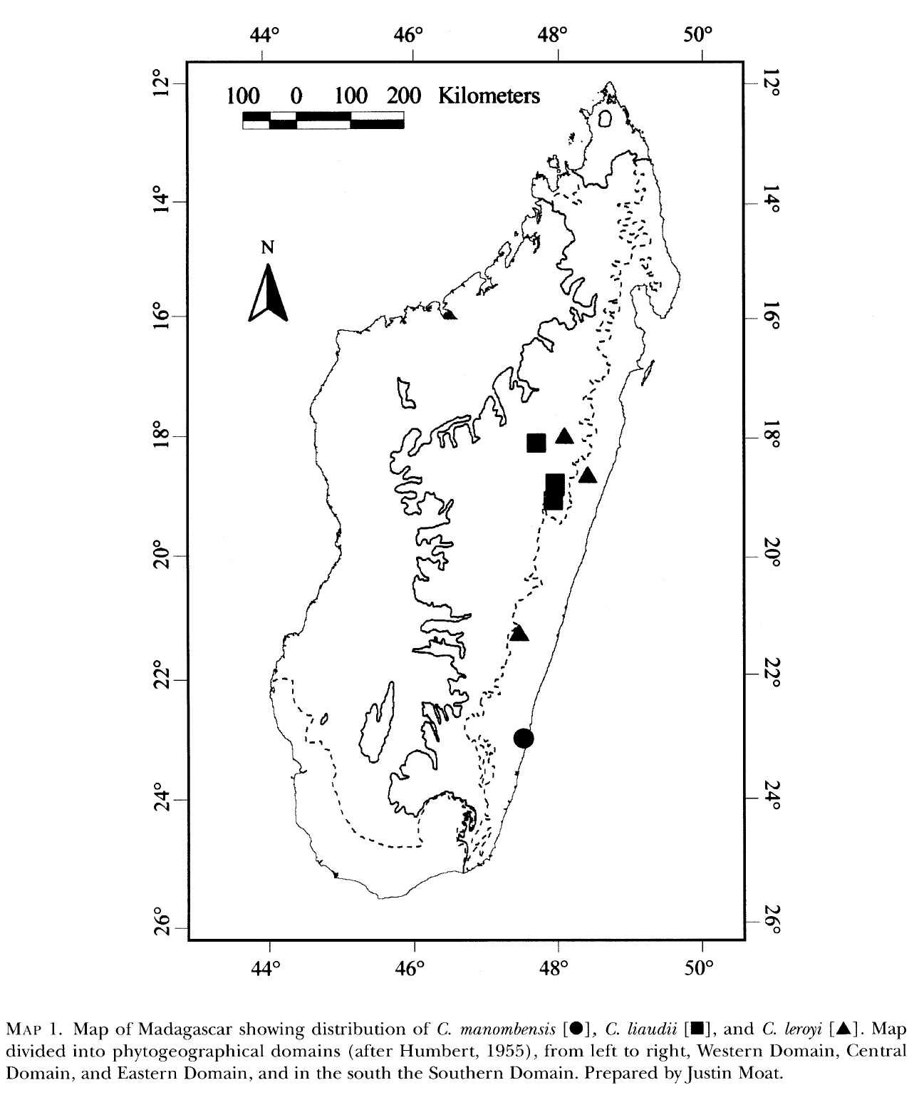 - 여기에서 기술하는 세 種은 마다가스카르 동부의 다른 모든 코페아 種과 공통적으로 상록수이다.