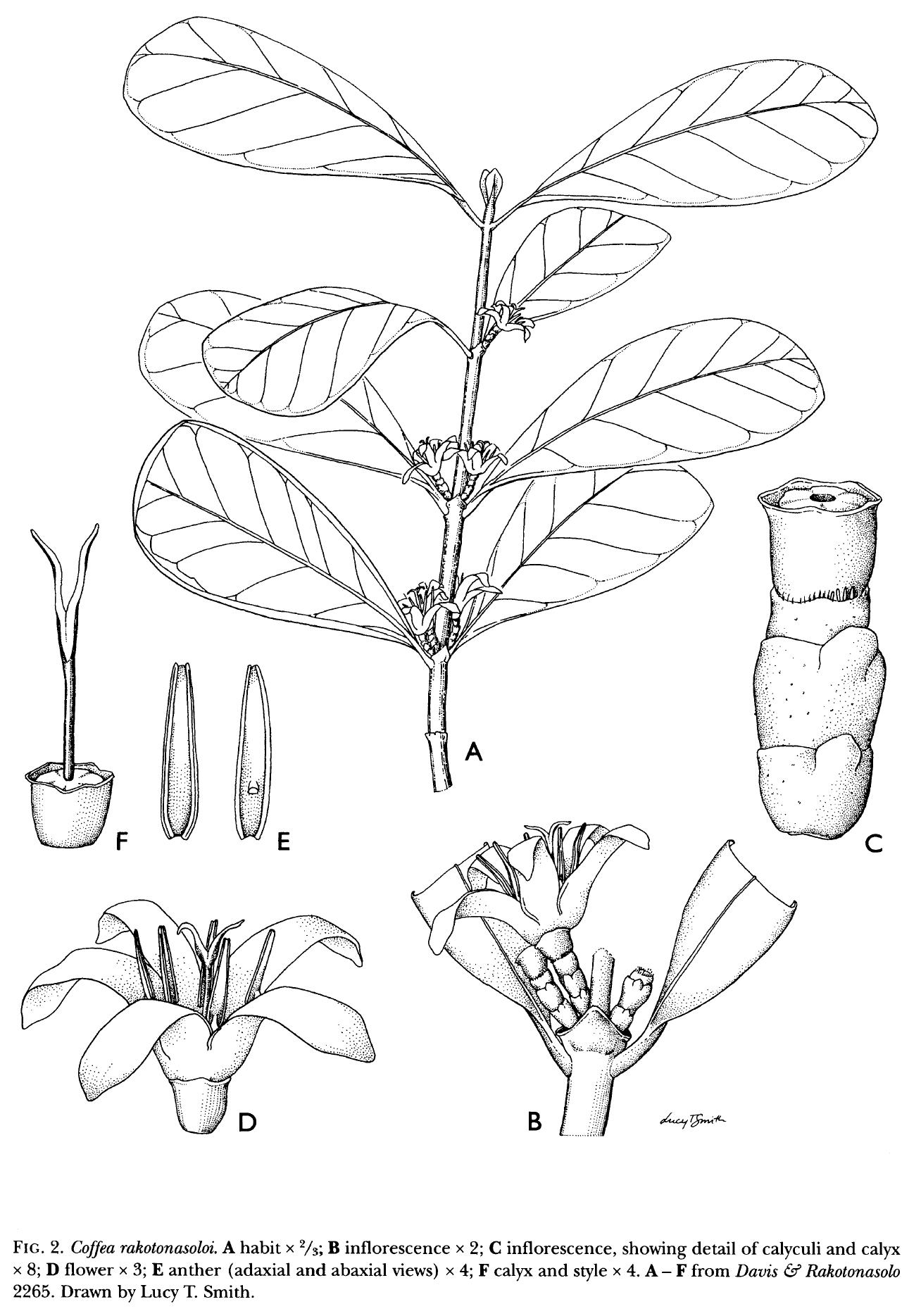 Coffea rakotonasoloi A. P Davis sp. nov. C. resinosae (Hook. f.) Radlk. affinis sed inflorescentiis unifloris (non 4- vel 7-floris), calyculis floribusque laevibus (non echinulatis), pedicellis 0.1 - 0.2 mm (non (0.5 -) 1.5 - 2 mm) longis, calycis limbo debili 5-lobato (haud truncato), distinguenda. Typus: Madagascar. Province Toamasina: Distr. Soanierana-Ivongo, 2 to 3 km W of Amberomanitra, near the R. Imawgna, 16°51'27"S 49°15'46"E, 500 m, 11 Nov. 1999, Davis & Rakotonasolo APD 2265 (holotypus TAN!, isotypi K!, MO!, P!, TEF!, BR!).