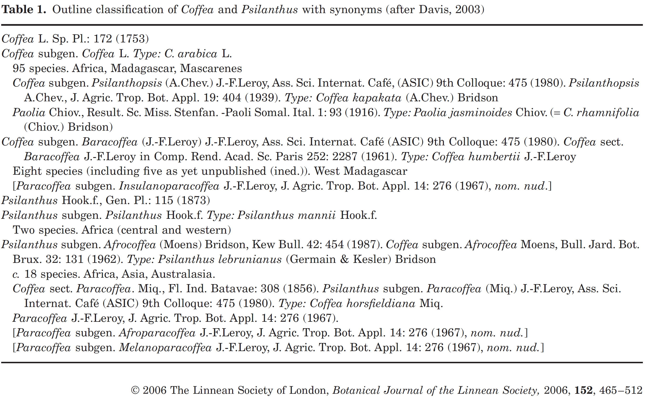 Coffea와 Psilanthus의 형태적 구분에 대한 광범위한 합의가 있다 (예: Robbrecht & Puff, 1986; Bridson, 1987, 1988a, b; Davis, 2003). 이는 주로 Leroy(1980a, b)의 연구에 기반을 두고 있으며, 주로 꽃 형태의 차이와 관련이 있다. 그러나 일부 마다가스카르 種 [대부분 Coffea subgen. Baracoffea (J.-F. Leroy) J.-F. Leroy, 아래 참조]는 Coffea의 형태학적 한계 결정을 훨씬 더 어렵게 만들었다 (Davis et al., 2005).