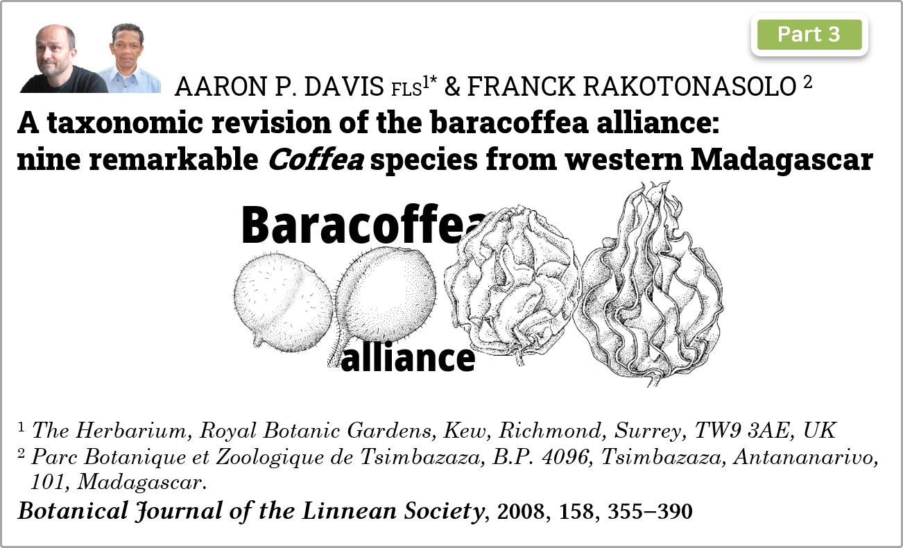 - Davis AP, Bridson DM, Rakotonasolo F. 2005. A re-examination of Coffea subgenus Baracoffea and comments on the morphology and classification of Coffea and Psilanthus (Rubiaceae–Coffeeae. In: Keating RC, Hollowell VC, Croat T, eds. A festschrift for William G. D’Arcy: the legacy of a taxonomist. (Monographs in Systematic Botany 104). Missouri: Missouri Botanical Garden Press, 398–420.