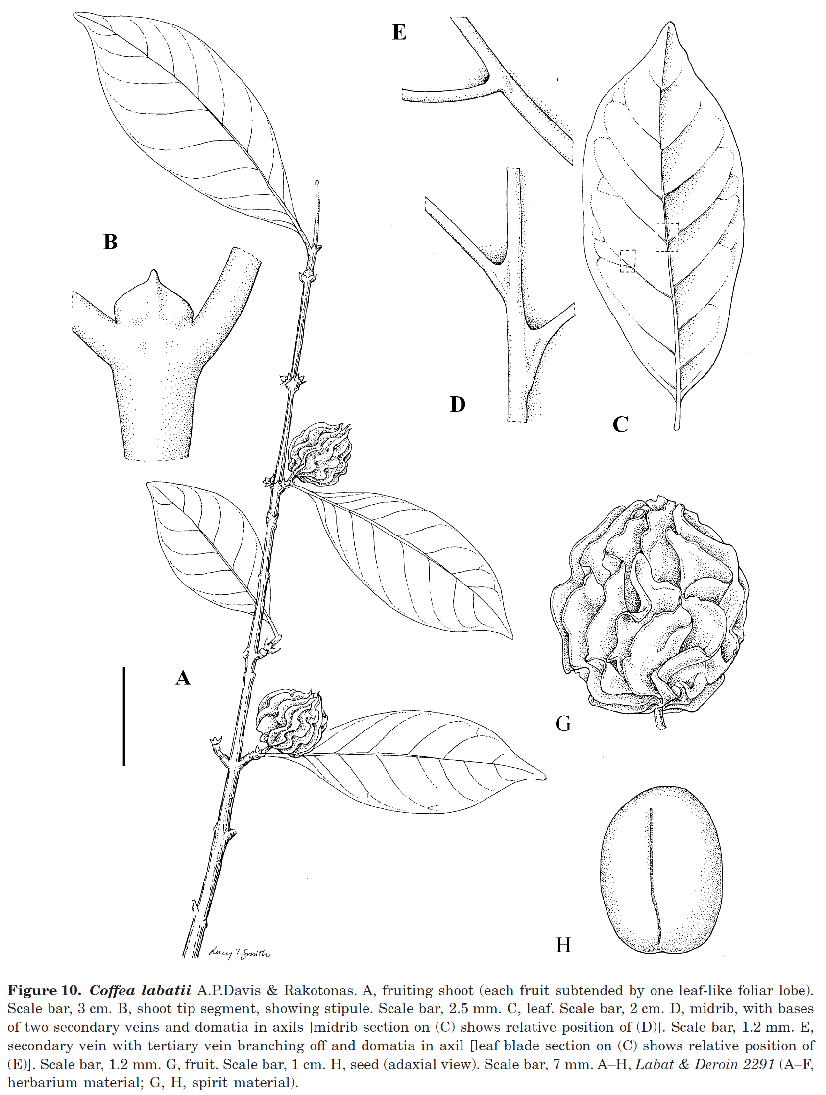 Coffea labatii는 국립공원 Tsingy de Bemaraha 내 Bekopaka (Belo-Sur Tsiribihina District)에서 사진 촬영(P. Hošek, 개인 통신)과 열매를 맺지 못하는 상태(sterile state)(F. Rakotonasolo, 개인 관찰)로 관찰되었다 (Fig. 14). 식물 표본은 제작되지 않았다.