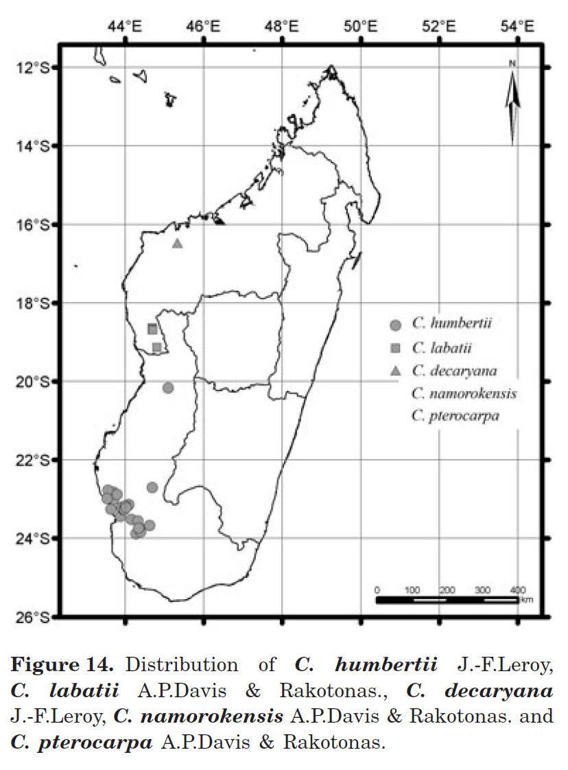 Coffea decaryana는 Réserve Naturelle Intégrale Namoroka (RN 8)에 국한되어 있으며 1940년에 그곳에서 수집한 싱글 컬렉션[Decary 15842 (P, K)]에서만 알려져 있다. 2000년에 우리는 이 종을 다시 수집하기 위해 Namoroka로 원정을 떠났지만 성공하지 못했다. 나모로카에서 수집하여 원래 우리가 C. decaryana (Davis & Rakotonasolo 2528 & 2537(herb. mult.); Davis et al. (2005: 420, fig. 6d, e)로 결정한 표본은 현재 별개의 종인 C. namorokensis(아래 참조)를 나타내는 것으로 생각된다.