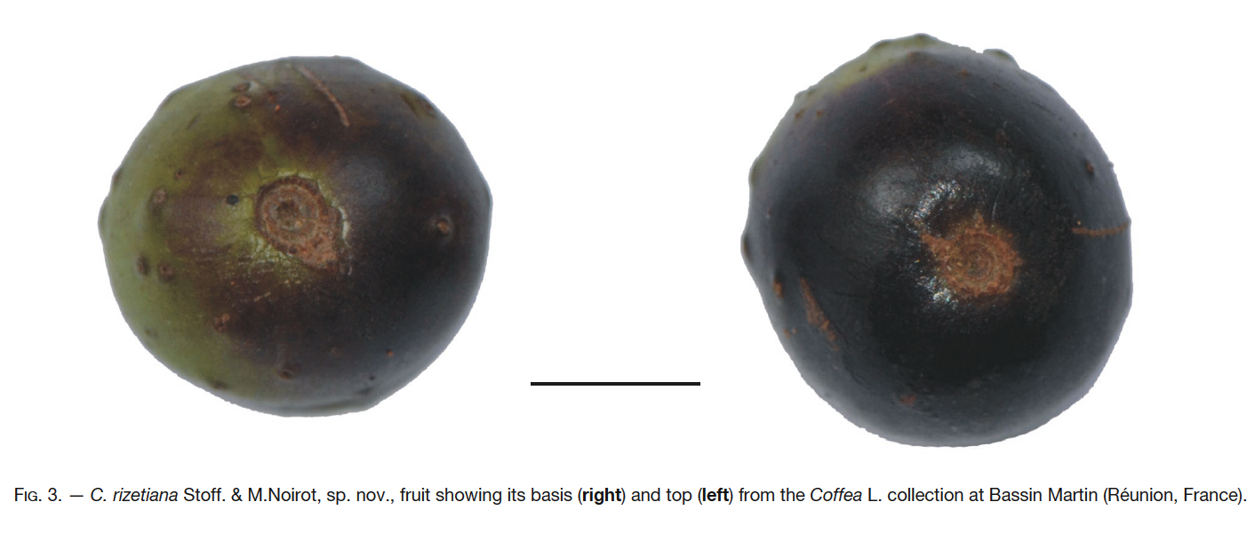 C. rizetiana Stoff. & M. Noirot, sp. nov. 전형적인 “커피콩” 씨앗 형태를 가지고 있으며, 이 특성은 Coffea s.s. 屬과 Psilanthus 屬에만 국한된다 (Stoffelen 1998; Davis et al. 2006). 노출된 암술대와 꽃밥(exserted style and anthers)은 이것을 Coffea s.s.屬(Stoffelen 1998) 또는 Coffea subgenus Coffea sensu Davis et al.(2005)에 속하게 한다. 대부분의 커피 종과 마찬가지로 그것은 id (Cros et al. 1994; Noirot et al. 2003)이다.