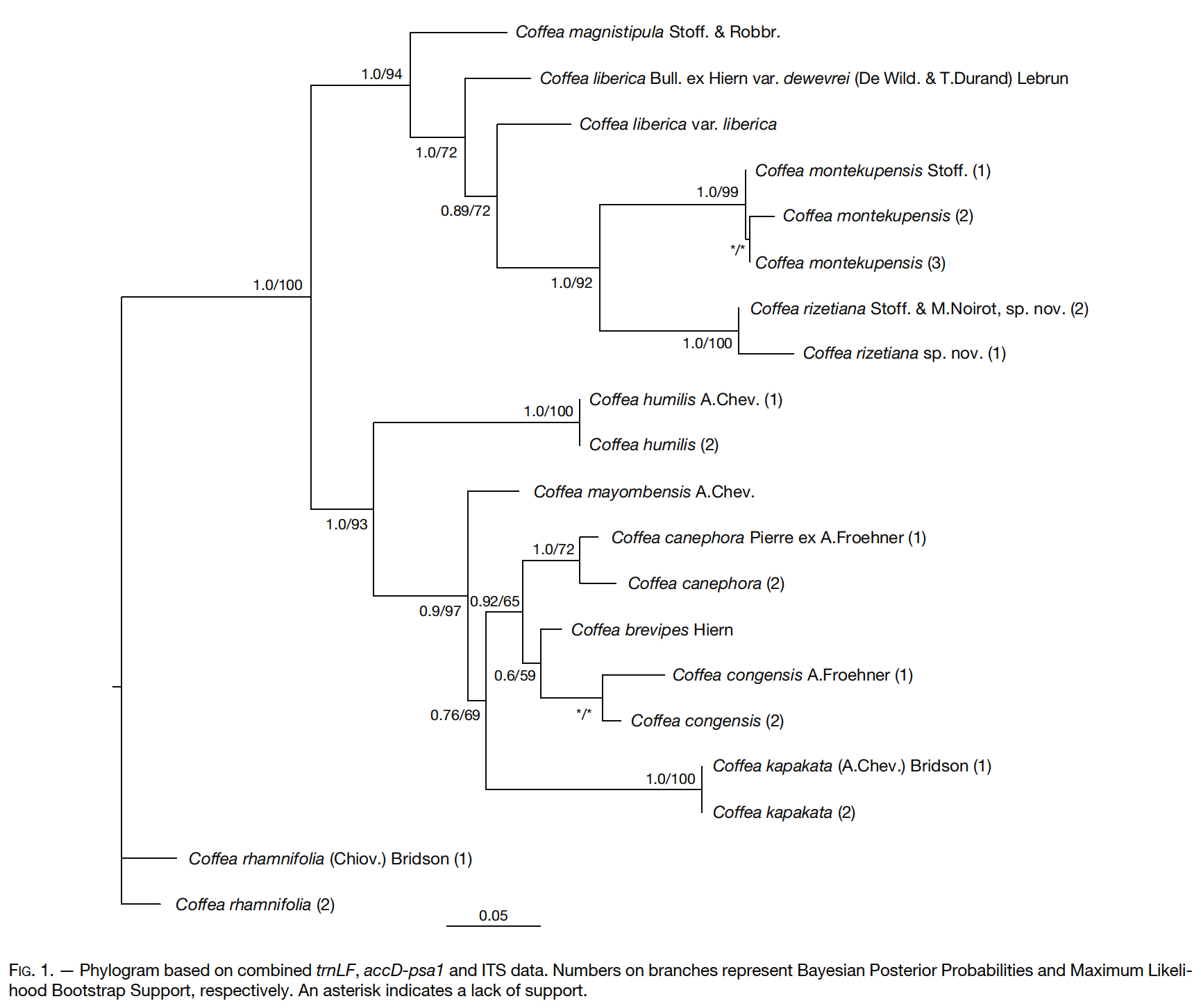 2) 신종 C. rizetiana Stoff. & M. Noirot, sp. nov.는 C. liberica 그룹에 속하지만 C. canephora 그룹과는 관련이 없다 ;