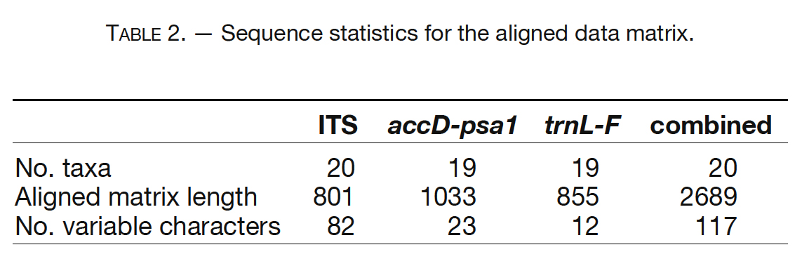 인접한 시퀀스들은 Geneious v7.0.6 (Biomatters, New Zealand)을 사용하여 조립했다. 자동 정렬은 E-INS-i 알고리즘 하에서, 100PAM/k=2 스코어링 행렬, gap open penalty 1.3, offset value 0.123을 사용하여 MAFFT (Katoh et al. 2002)로 수행했다. 정렬된 데이터 세트에 대한 후속의 수작업적 미세 조정은 Geneious v7.0.6에서 수행했다. 핵 및 엽록체 데이터 세트 간의 일치성은 PAUP*4.0b10a (Swofford 2002)에 구현된 분할 동질성 테스트(partition homogeneity test)를 통해 추론했다. 또한 핵 및 엽록체 매트릭스 간의 가능한 상충들을 시각적으로 검사하여 각 토폴로지 내에서 강력하게 뒷받침되는 상충되는 관계(conflicted relationships)를 찾았다 (Johnson & Soltis 1998). 각 색소체(plastid)와 핵 데이터세트에 대한 최적 뉴클레오티드 치환 모델(best-fit nucleotide substitution model)은 the Akaike information criterion (AIC)에 따라 jModelTest 2.1.4(Posada 2008)를 사용하여 결정했다. TVM+G 모델은 ITS에 가장 적합한 것으로 나타났고, GTR 모델은 accD-psa1과 trnL-F에 가장 적합한 치환 모델로 계산되었다. 각 DNA 영역에 다른 진화 모델을 적용하기 위해 결합된 데이터세트를 분할하는 혼합 모델 접근방식이 사용되었다 (Ronquist & Huelsenbeck 2003).