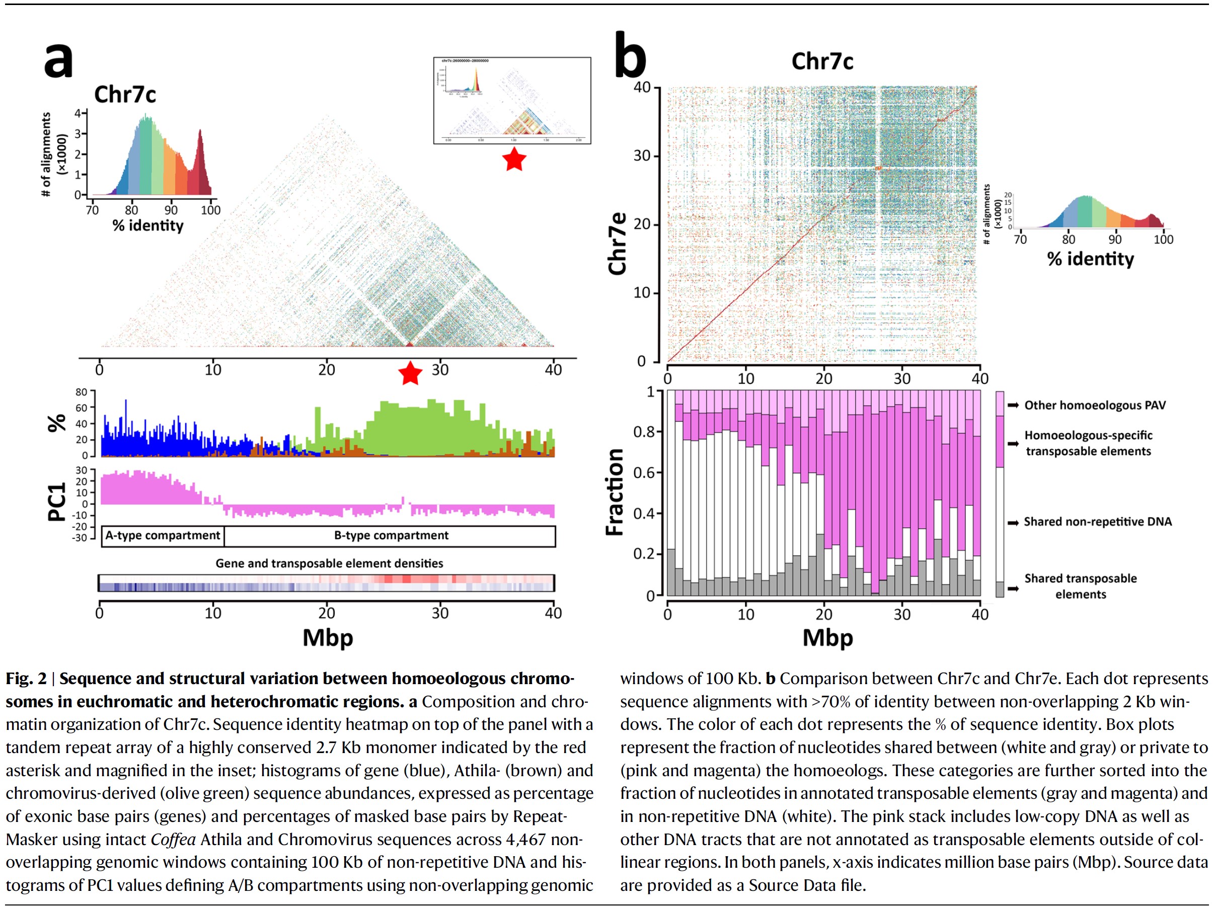 SNP frequency, nucleotide diversity, gene and TE densities 그리고 C. canephora introgressions에 대한 분석에 사용되었다. - Identity heatmaps를 통한 직렬 반복 구조(tandem repeat structures)의 염색체-규모 시각화는